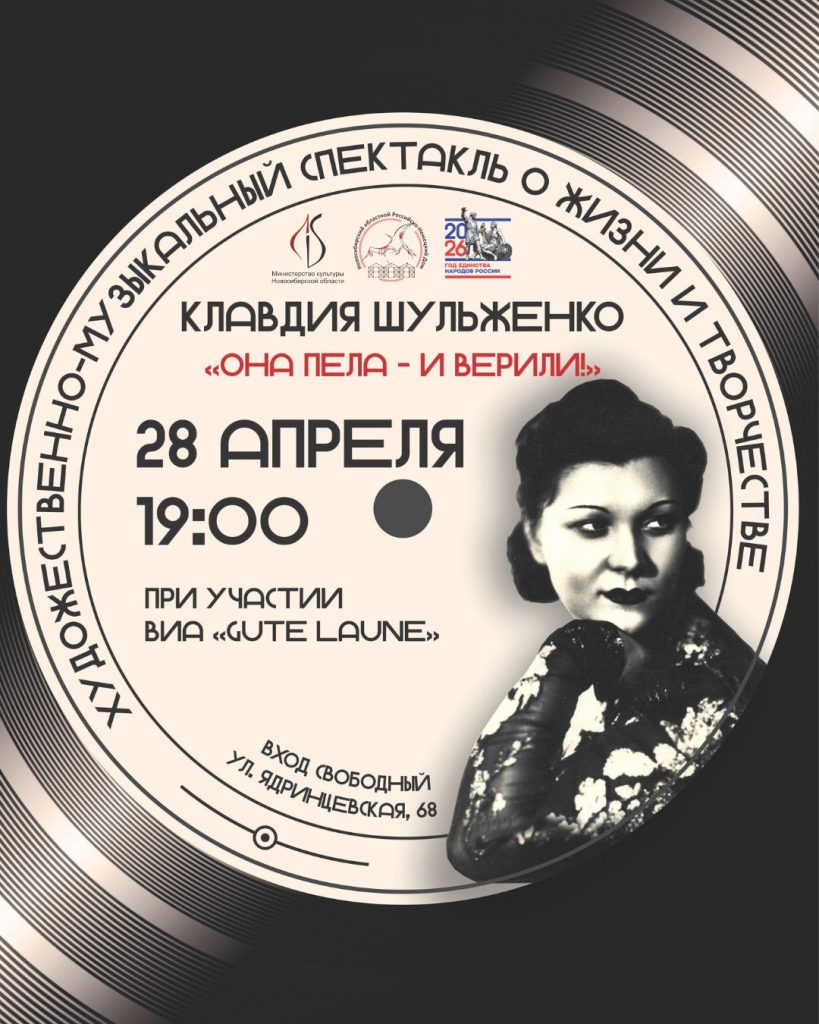 28 апреля в 19:00 Новосибирский областной Российско-Немецкий Дом приглашает на художественно-музыкальный спектакль «Она пела – и верили», посвященный 120-летию со дня рождения Клавдии Шульженко.